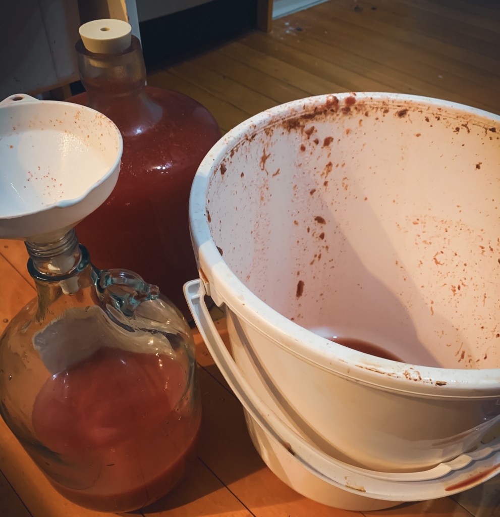 After 4-7 days, you need to remove the liquid from the bucket, and put it into bottles or demijohns with an airlock. Don’t worry too much about getting pulp into the bottles, as long as there are no large chunks that float. Well, ending up with a few big chunks doesn’t matter too much, but it’s better to avoid too many.