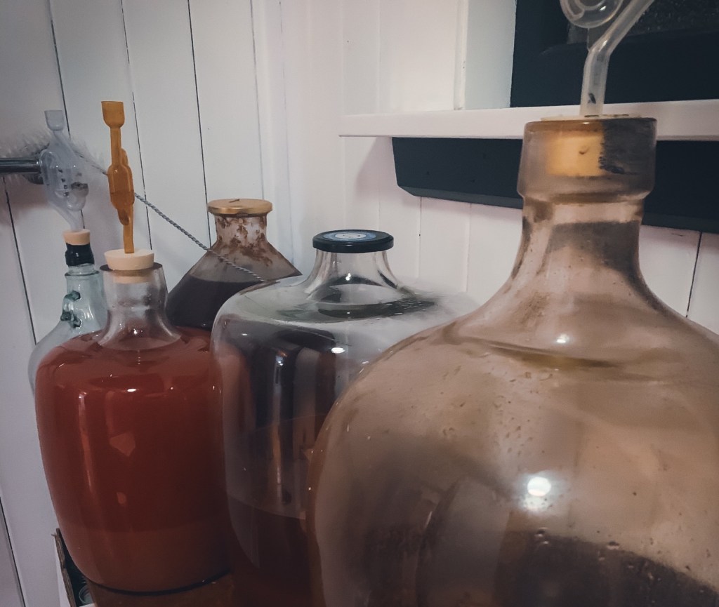 - A large demijohn and airlock. (I sourced some 2nd hand later in my wine-making journey. Early on I just used re-used wine bottles with balloons with pin holes as an airlock.
